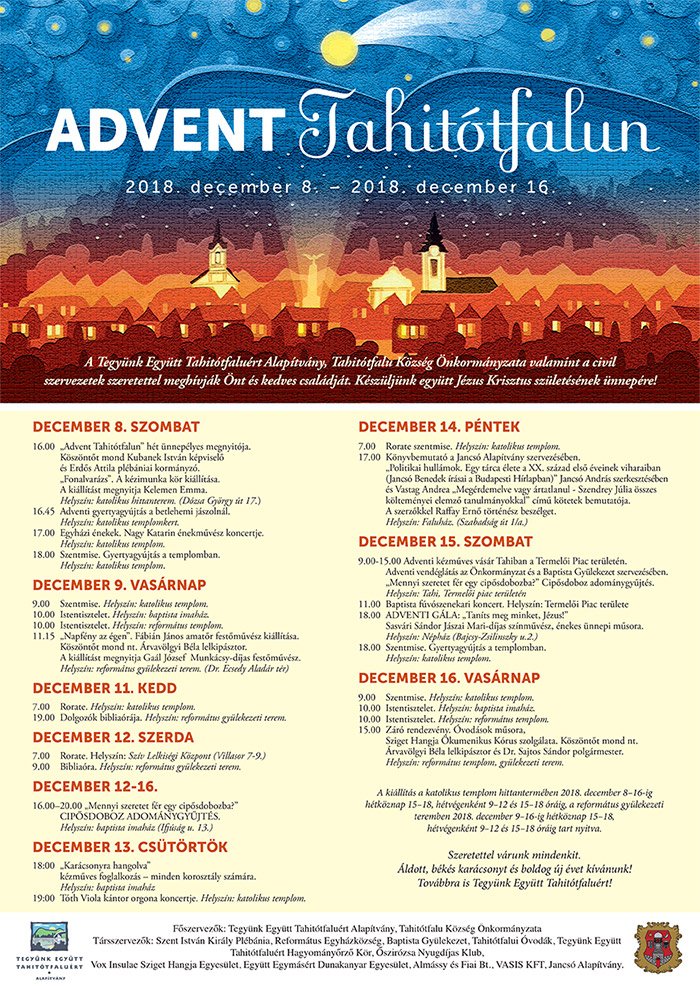Óvodások műsora, Sziget Hangja Ökumenikus Kórus szolgálata. Köszöntőt mond nt. Árvavölgyi Béla lelkipásztor és Dr. Sajtos Sándor polgármester. Helyszín: református templom, gyülekezeti terem.