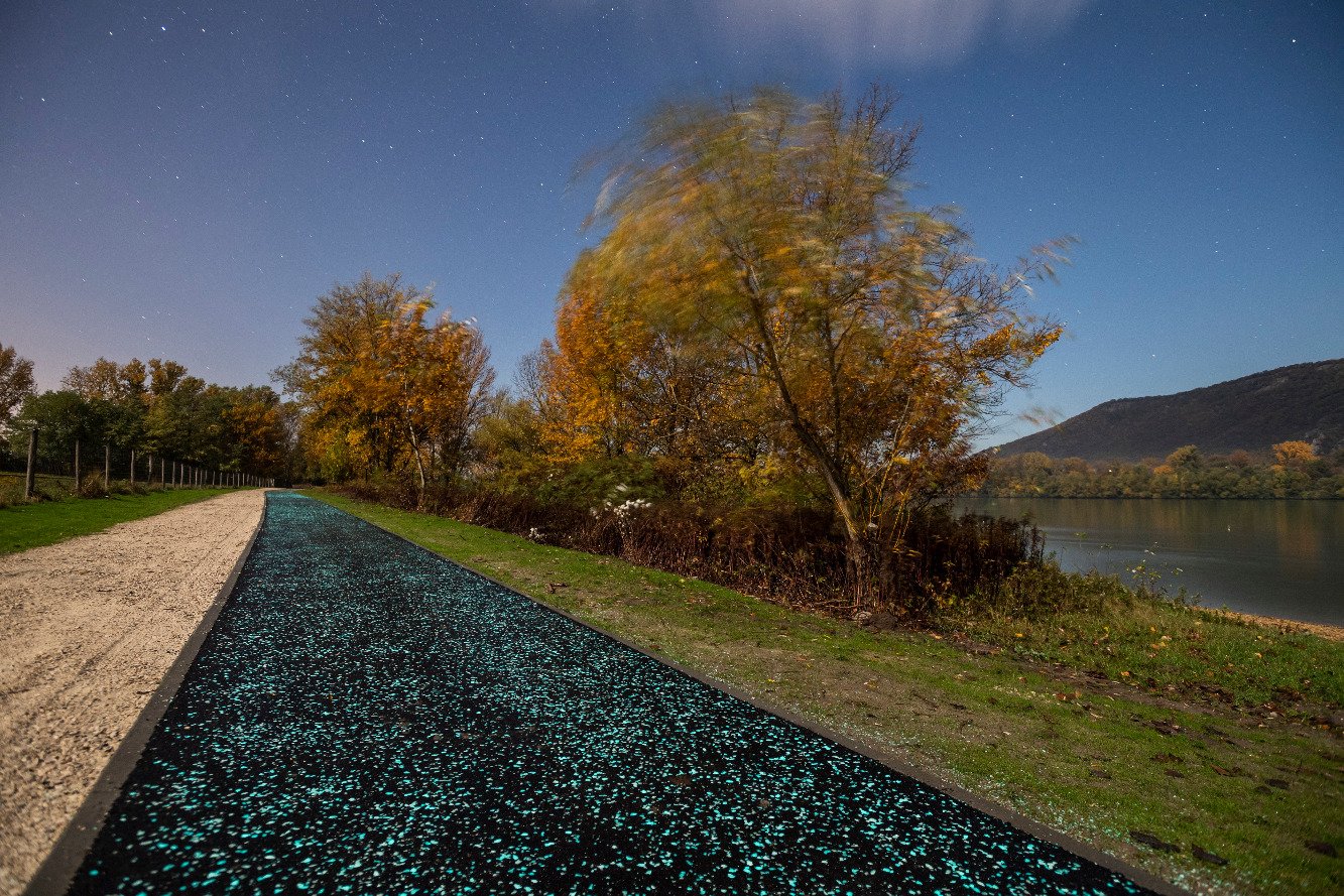 A képen az EuroVelo 6 kerékpárút fotolumineszcens boroszilikát szemcsékkel ellátott burkolatú új szakasza látható Esztergomnál 2020. október 29-én. Az út kopórétegébe kevert, gyantába ágyazott szilikát képes magába szívni és tárolni a napfény energiáját, majd azt éjszaka visszasugározni. MTI/Mónus Márton