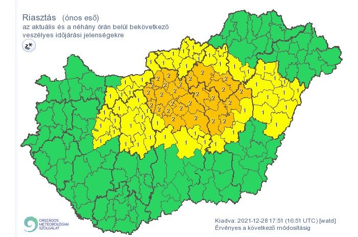 Az MTI-hez eljuttatott veszélyjelzésük szerint Budapestre, valamint Pest megye több járására adták ki a másodfokú riasztást. Ezeken a területeken a következő órákban tartós ónos eső várható.